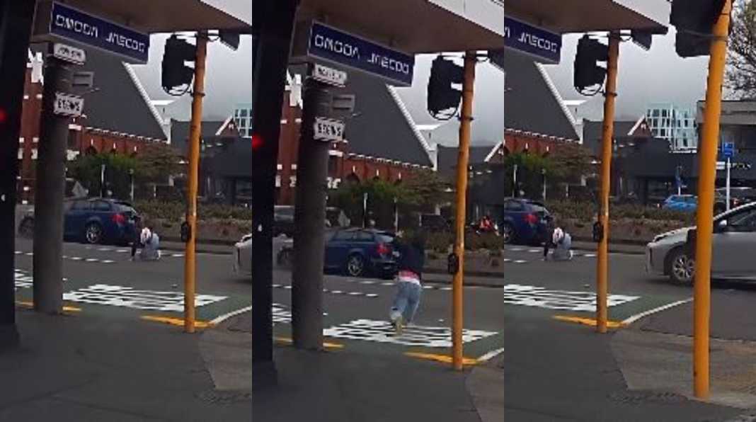 Në pamje, gruaja shihet teksa era e shtyn drejt rrugës ku kalojnë makinat, derisa humb kontrollin dhe bie në asfalt. Fatmirësisht, në ato momente nuk po kalonte asnjë automjet, ndërsa shoferët që ishin pranë vendngjarjes ndaluan menjëherë.