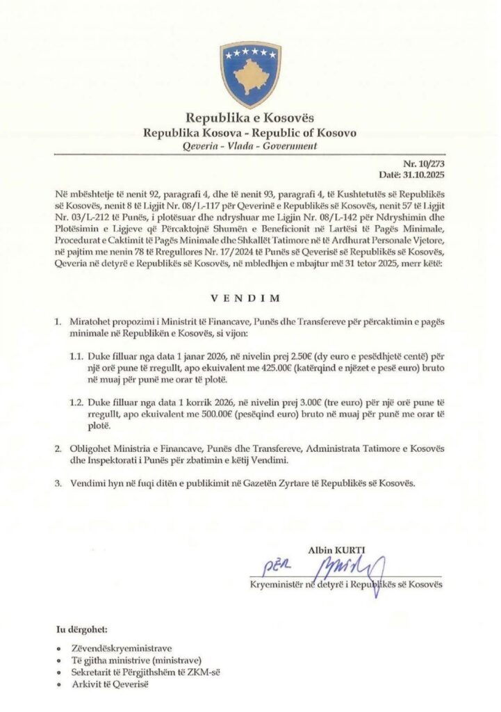 Sipas vendimit zyrtar me numër 10/273, të datës 31 tetor 2025, i nënshkruar nga kryeministri në detyrë Albin Kurti, paga minimale do të jetë: 425 euro bruto duke filluar nga 1 janari 2026, për një punë të rregullt me orar të plotë dhe 500 euro bruto duke filluar nga 1 korriku 2026, po ashtu për punë të rregullt me orar të plotë.
