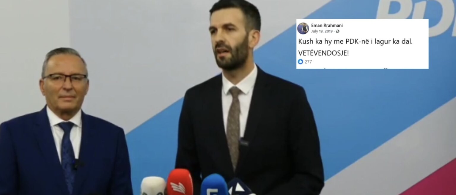 Rrahmani, në kohën kur shërbente si deputet i VV-së, kishte bërë një deklaratë të bujshme në rrjetet sociale për ata që i bashkoheshin PDK-së. Në qershor të vitit 2019 ai kishte shkruar: