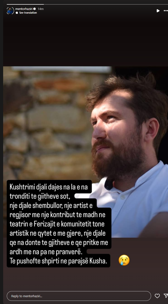 “Kushtrimi, djali dajës, na la e na tronditi të gjithëve sot. Një djalë shembullor, një artist e regjisor me një kontribut të madh në teatrin e Ferizajt e komunitetin tonë artistik në qytet e më gjerë. Një djalë që na donte të gjithëve e që pritej me ardh me na pa në pranverë. Të pushoftë shpirti në parajsë, Kusha.”