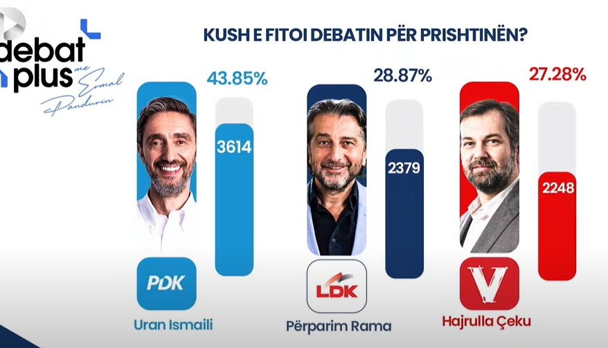 Debati i zhvilluar sonte në “Debat Plus” ku u përballen kandidatët kryesorë për kryetar të Prishtinës – Urani Ismaili (PDK), Përparim Rama (LDK) dhe Hajrulla Çeku (VV) – ka nxjerrë një fitues sipas shikuesve të debatit që u bënë pjesë e një televotimi që qëndroi i hapur gjatë përballjes televizive.