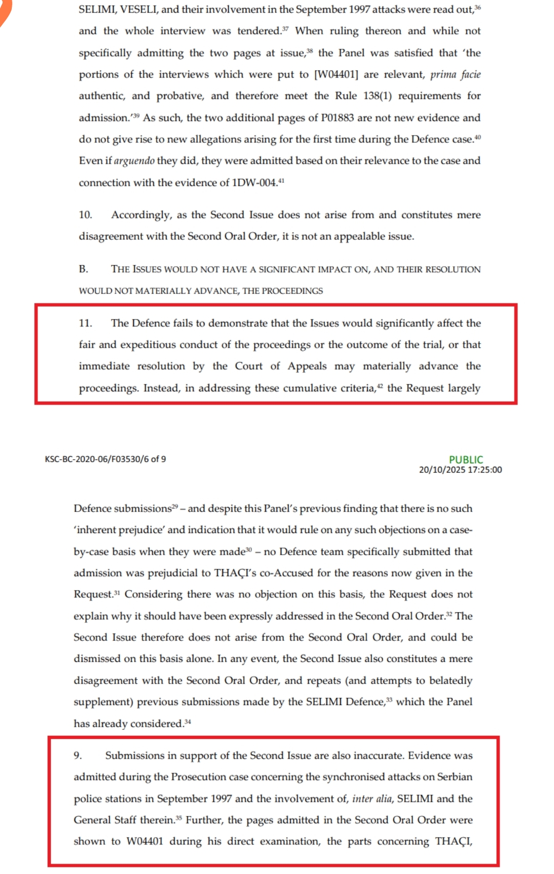 “Për më tepër, faqet që ishin pranuar nëpërmjet Urdhrit të Dytë Gojor iu treguan dëshmitarit W04401 gjatë ekzaminimit të tij të drejtpërdrejtë. Pjesët që kishin të bënin me Thaçin, Selimin dhe Veselin, si dhe me përfshirjen e tyre në sulmet e shtatorit 1997, u lexuan me zë gjatë seancës, ndërsa i tërë intervistimi u paraqit si provë. Kur trupi gjykues mori vendim mbi këtë çështje, edhe pse nuk i pranoi në mënyrë specifike dy faqet në fjalë, ai u shpreh i bindur se ‘pjesët e intervistave që iu parashtruan dëshmitarit [W04401] janë të rëndësishme, në dukje autentike dhe me vlerë provuese, dhe për rrjedhojë i plotësojnë kërkesat e Rregullës 138(1) për pranueshmëri’”, thuhet në parashtresën e organit të akuzës.